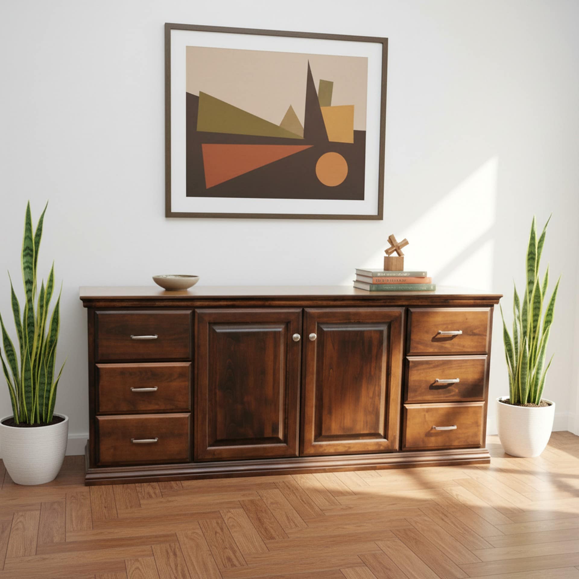 4 Standard sizes with 6 drawers, center cabinet with 2 adjustable shelves, and additional shelving may be purchased