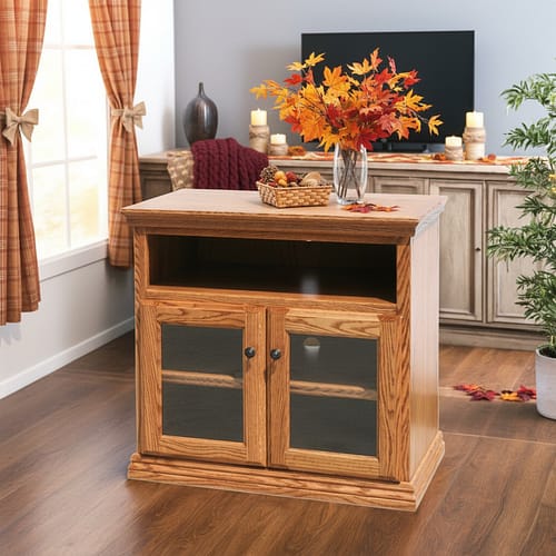All models come standard with two 6″ height open device storage areas and four full glass doors for hidden storage below