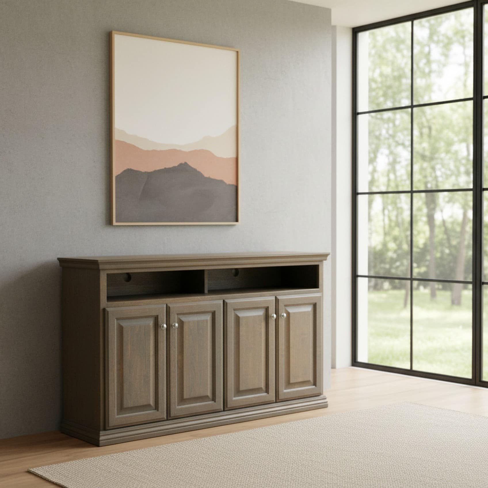 Designed to be that focal point for your display, media devices, storage, and ready for any room in your home with two open spaces and two cabinets, our Traditional-style CN4 Series, with its adjustable shelving and multi-Standard size availability, will be that solution. Mix or match to meet your needs!