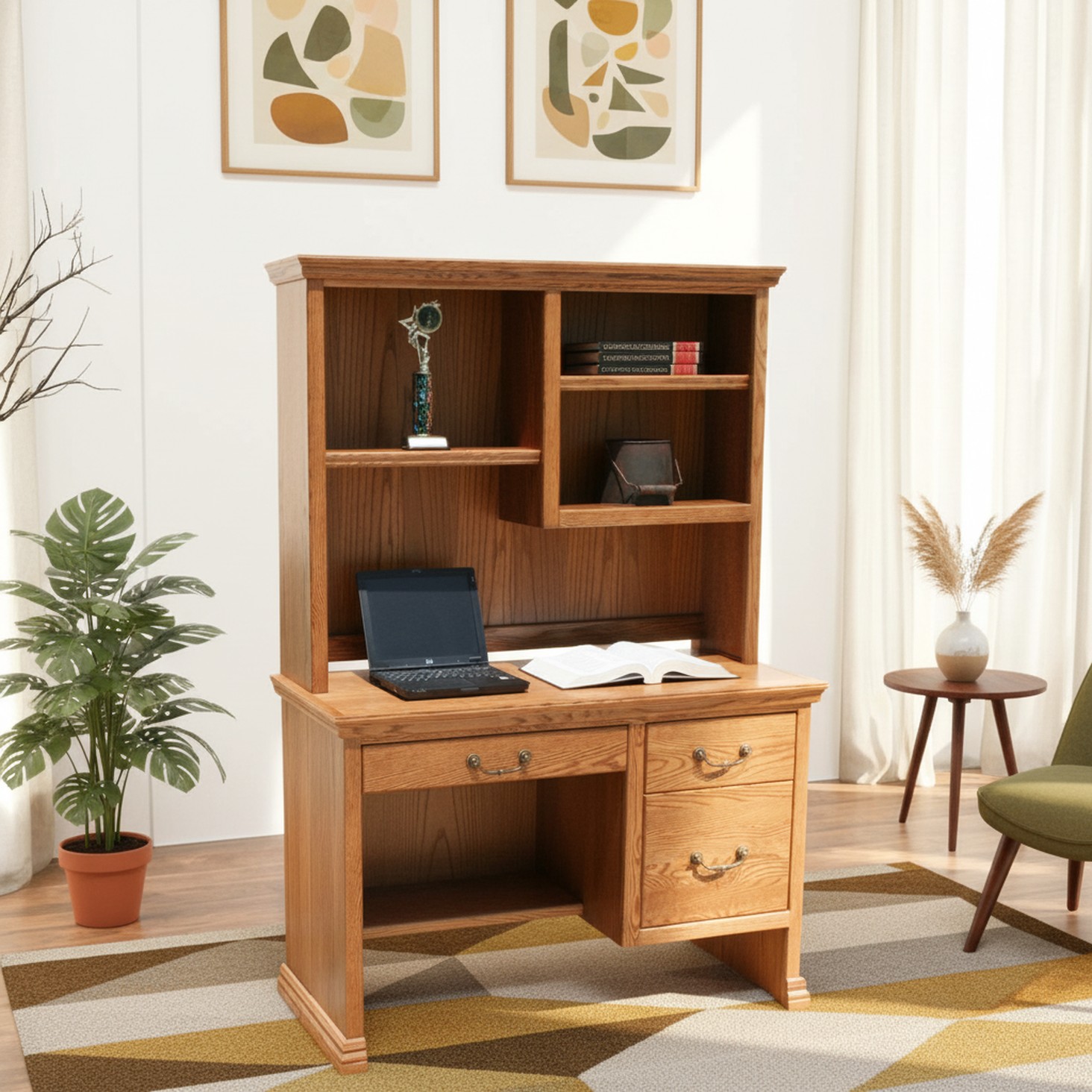 • Hutch includes 3 open storage areas for books, paper, or any other items needed within an arm’s reach, and is held on top of the desk by gravity