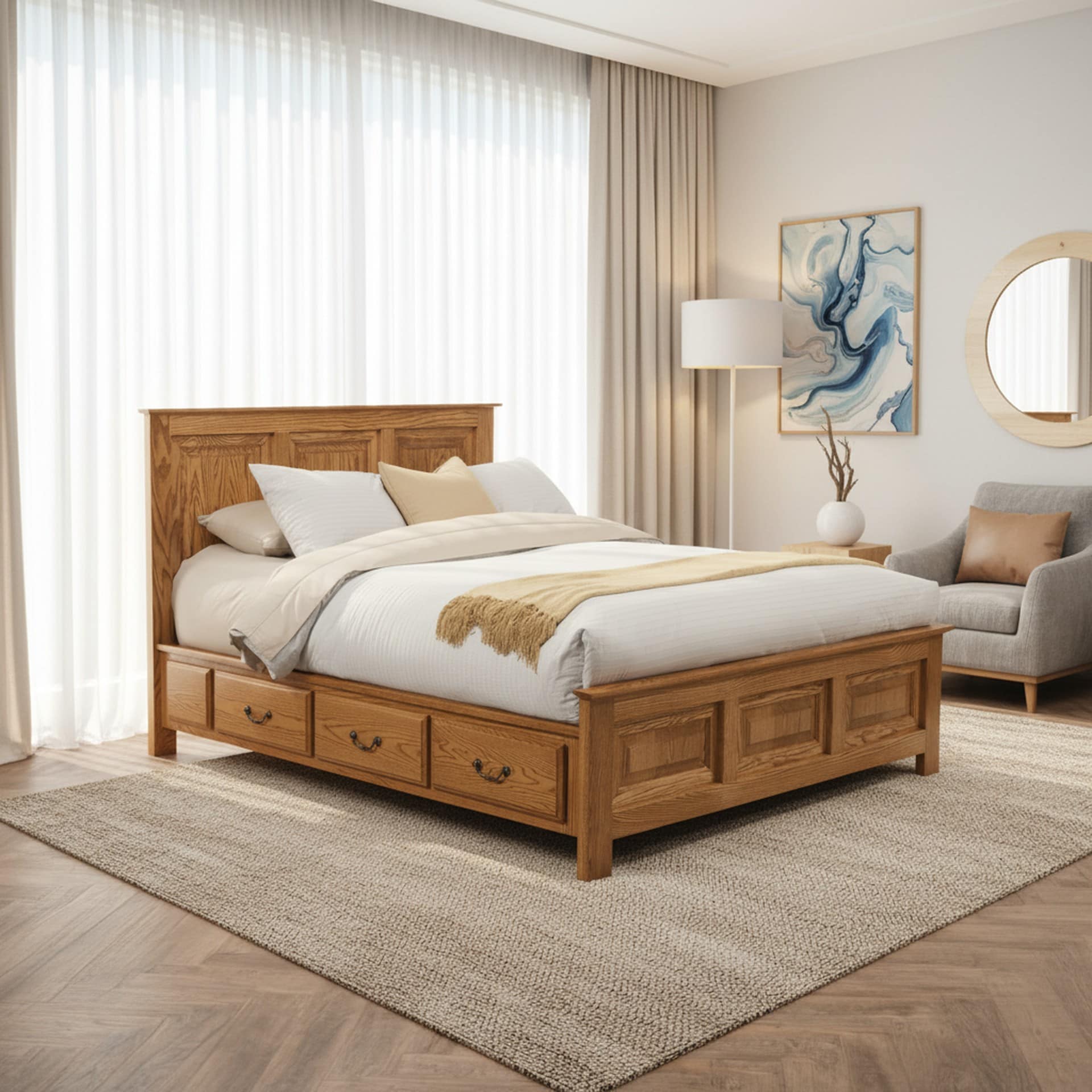 • 4-piece bed set includes a 54″ H raised panel headboard, 20″ H footboard, two elevated pedestals – each with 3 15″ deep drawers (6 total) and a storage cubby with a raised panel door (2 total)