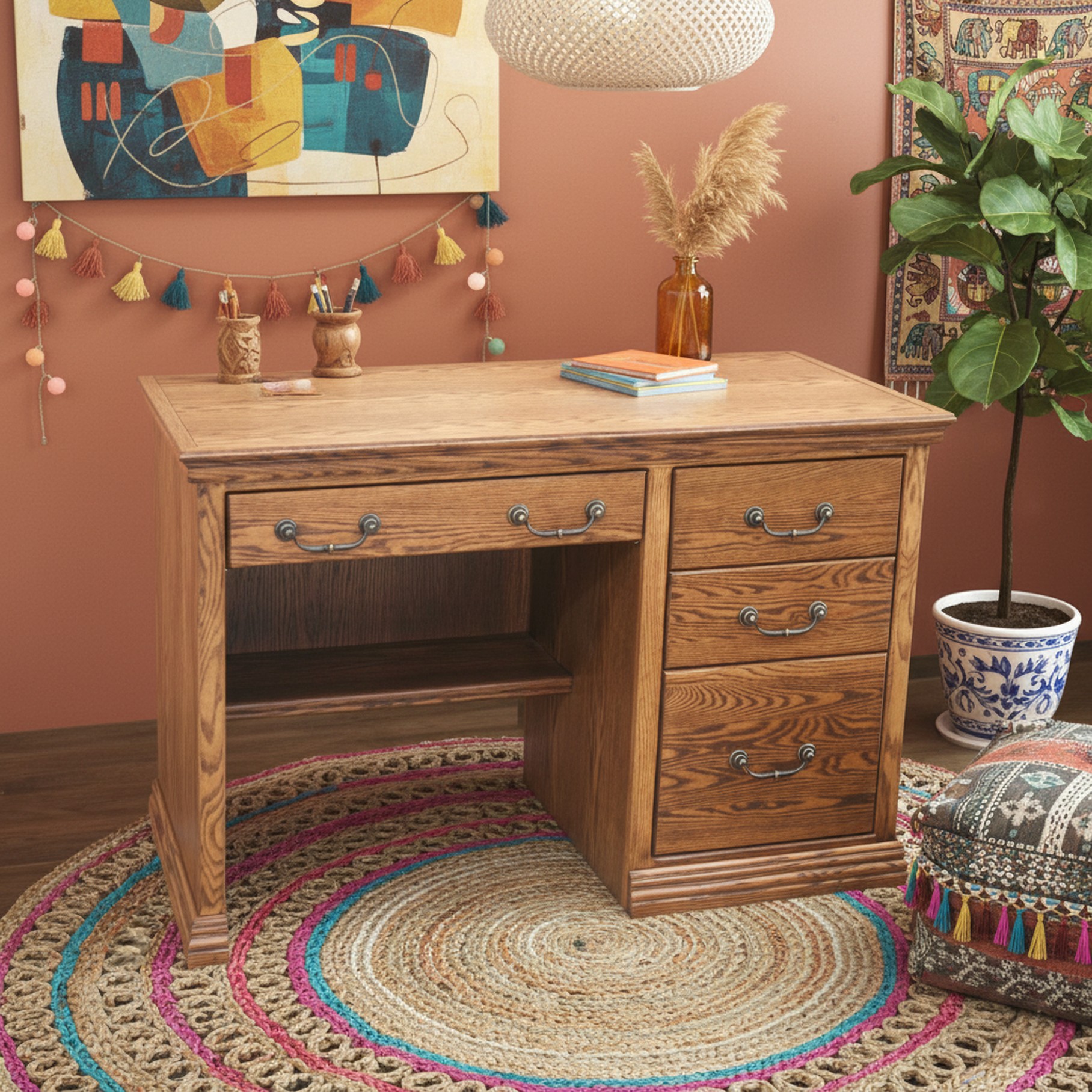 Desk is crafted with 2 utility drawers, 1 letter file drawer, and 1 drop-down keyboard drawer, and finished all around including clear coat lacquer on the inside,