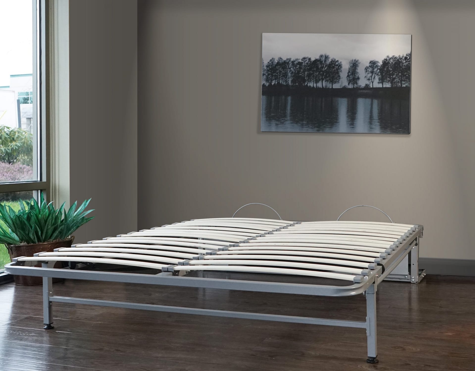 • Grey powder coated free standing steel wall bed with counter balanced spring system
